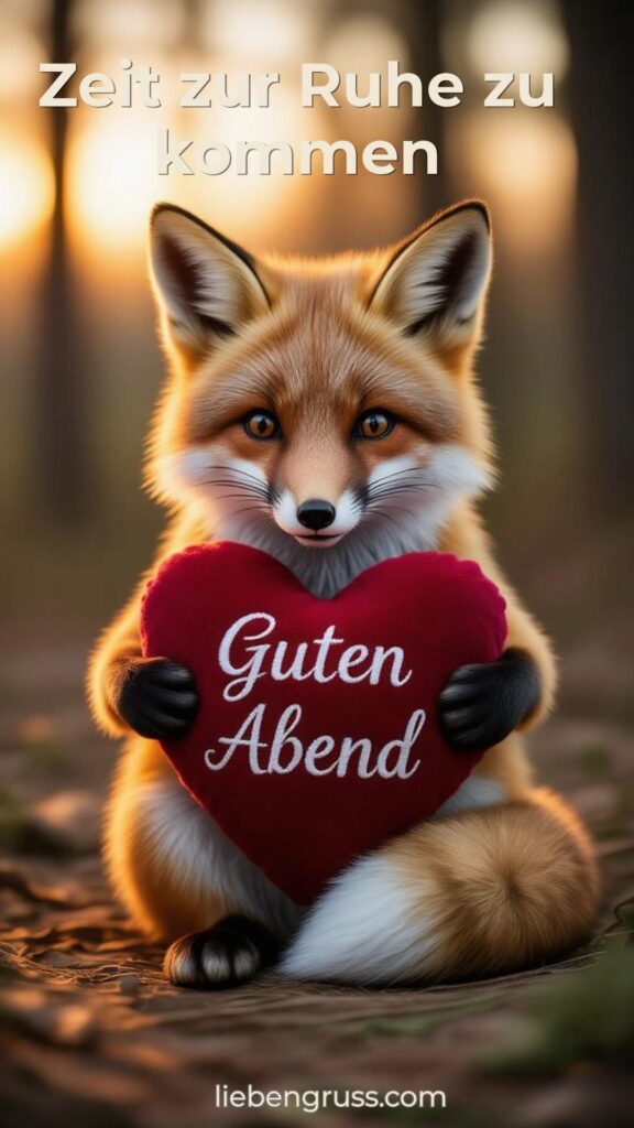 Ein kleiner Fuchs steht in der ruhigen Dämmerung im Wald und hält ein rotes Plüschherz mit „Guten Abend“ in den Pfoten. Die sanfte Abendstimmung mit warmem Licht und natürlichen Farben vermittelt Ruhe und Geborgenheit perfekt für einen liebevollen Tagesabschluss. 💛