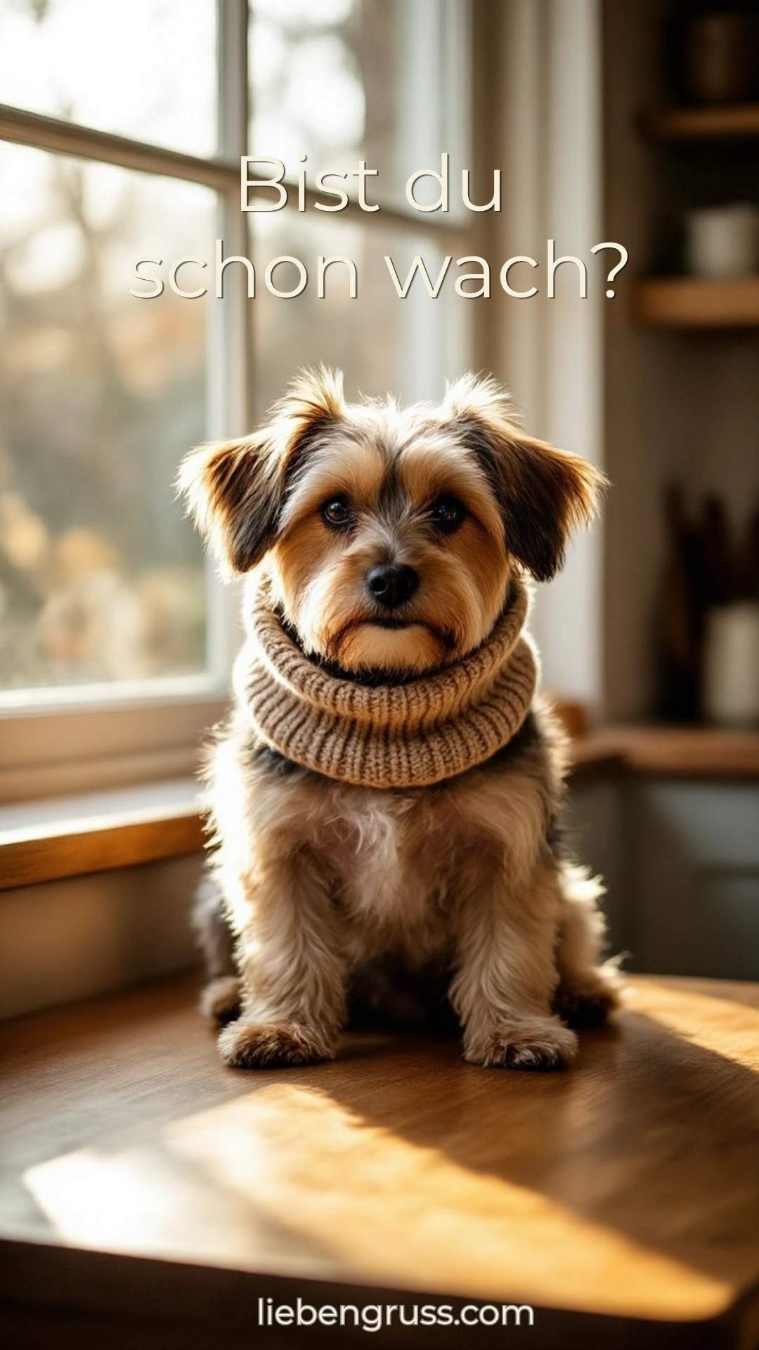 Ein kleiner Hund sitzt neugierig auf dem Küchentisch und schaut dich aufmerksam an. Die freundliche Morgenszene vermittelt Wärme und einen liebevollen Start in den Tag perfekt für einen herzlichen Guten-Morgen-Gruß. 💛