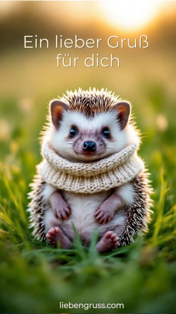 Ein kleiner Igel sitzt im weichen Gras und trägt einen beigen Loop-Schal. Die ruhige, warme Szene vermittelt Geborgenheit und eignet sich perfekt für liebevolle Grüße im Alltag ein stiller Moment, der von Herzen kommt. 💛