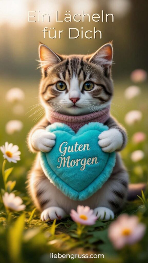 Ein kleines Kätzchen steht auf einer Wiese voller Gänseblümchen und hält ein türkisfarbenes Plüschherz mit „Guten Morgen“ in den Pfoten. Die helle, freundliche Szene vermittelt Frische und Leichtigkeit und eignet sich perfekt für einen liebevollen Start in den Tag. 💛